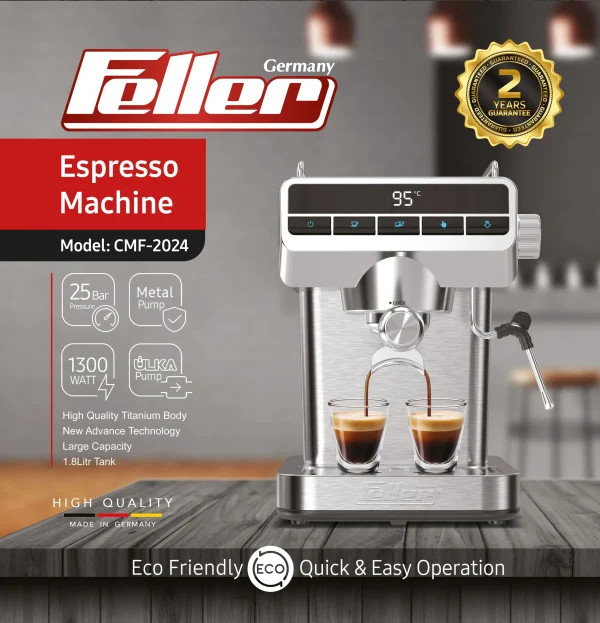 دستگاه اسپرسو ساز مدل CMF-2024 از برند معتبر Feller Germany یکی از تجهیزات مدرن و پیشرفته برای علاقهمندان به تهیه قهوه در خانه و کافههای کوچک است. این دستگاه با ویژگیهای فنی و طراحی برجسته، تجربهای حرفهای از تهیه اسپرسو و نوشیدنیهای مختلف قهوه را فراهم میکند. در ادامه به توضیحات بیشتری درباره این دستگاه میپردازیم.