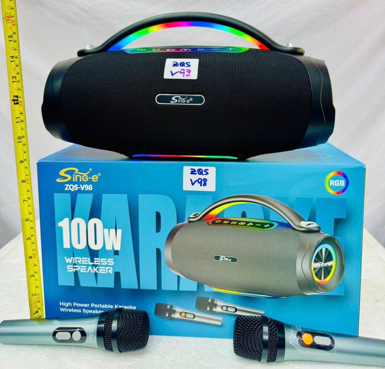 اسپیکر قابل حمل Singe ZQS-V98 یک انتخاب عالی برای مهمانیها، دورهمیها، اجرای کارائوکه و استفاده روزمره است. با توان خروجی 100 وات واقعی، نورپردازی RGB، دو میکروفون بیسیم و باتری قدرتمند، این اسپیکر همه قابلیتهایی که از یک سیستم صوتی حرفهای انتظار دارید را در یک محصول جمع کرده است.