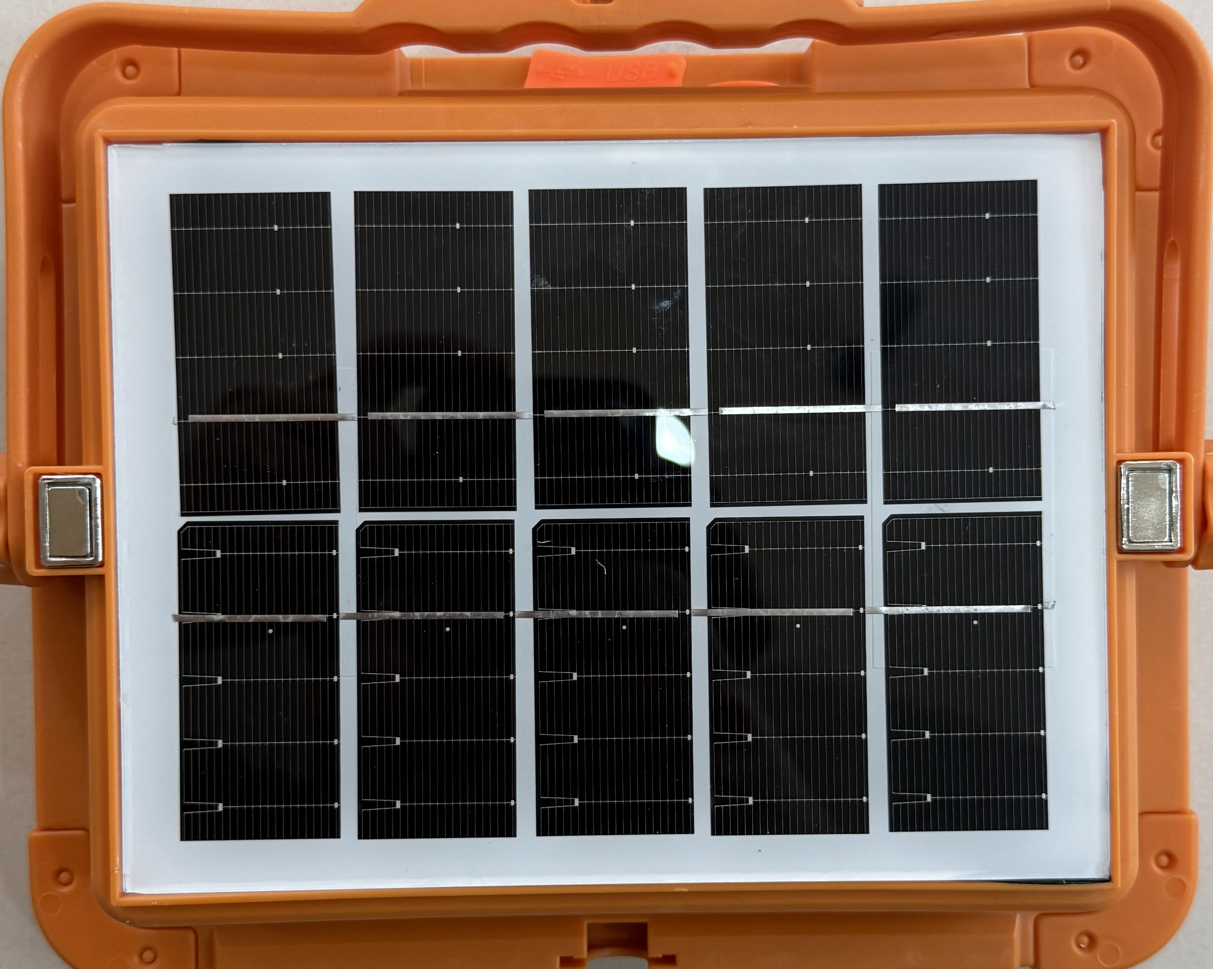 پنل خورشیدی فعال (با نور خورشید یا نور محیطی شارژ میشود و چراغ های شارژ نیز روشن میشوند هنگام در برابر نور قرار گرفتن)
